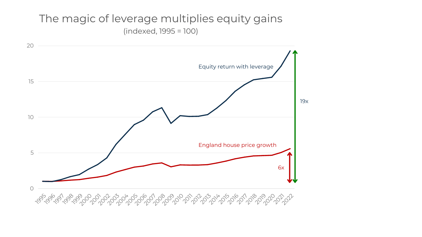 The ability to purchase real estate with a mortgage (leverage) means the return on your equity are a multiple of the actual house price growth